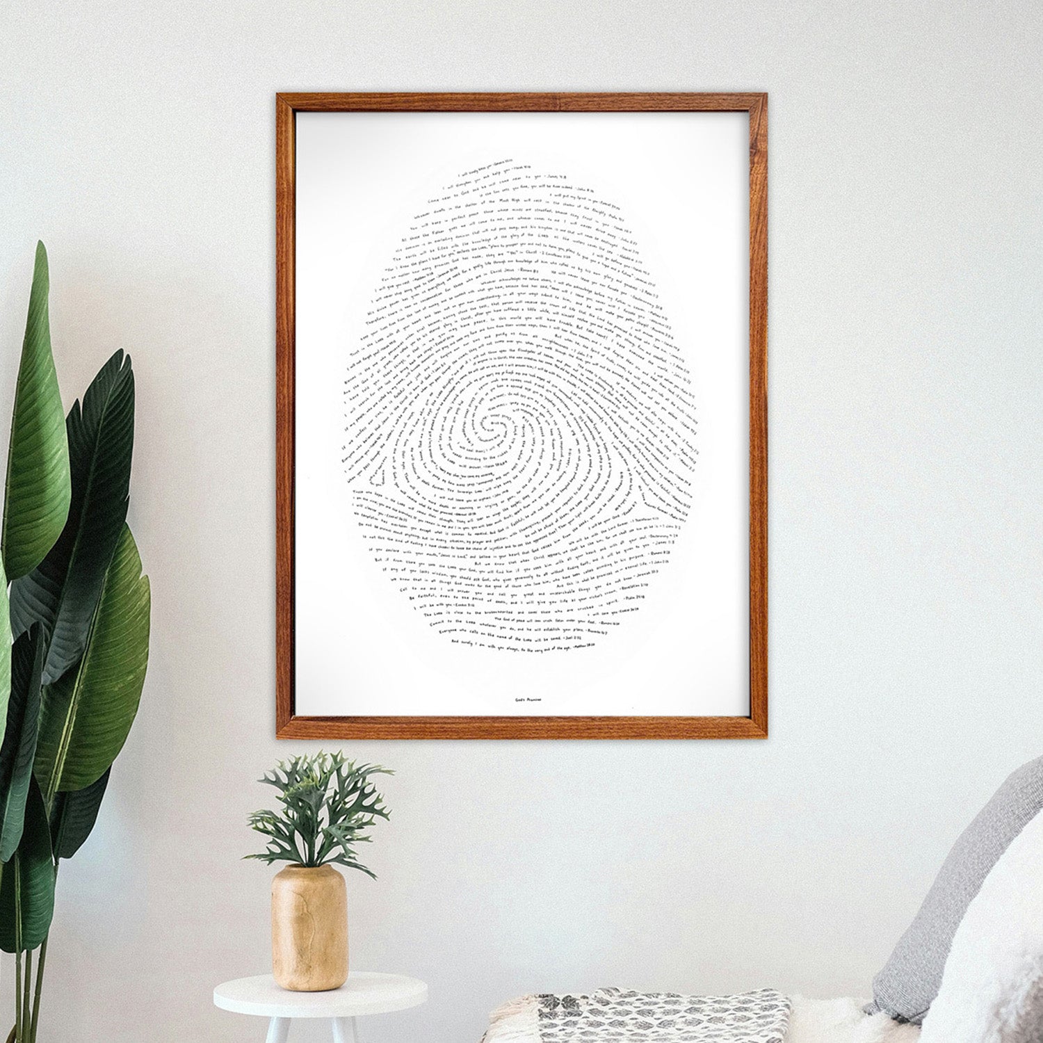 This artwork is filled entirely with the promises of God. Hand-written into a fingerprint, each line contains a unique promise from Scripture.